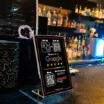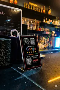 Suporte Premium totalmente adaptado à identidade visual da tua empresa. Escolhe as funções exatas do NFC e do QR Code (Avaliações, Menu Digital ou acesso WiFi) e oferece uma experiência de marca imersiva e altamente profissional.